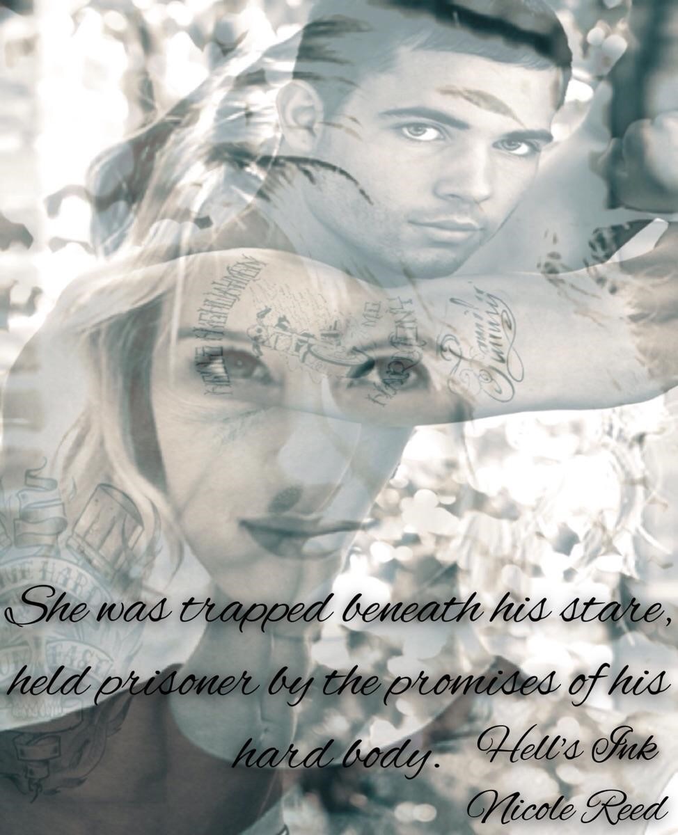 He watched her slender artist’s hand caress her taut, tattooed abdomen, instantly jealous that it wasn’t his own blunt fingers that idly drifted across her silky flesh. Her eyes flickered with awareness to where he stood at the end of the bed watching her. It only made his balls draw up tight. His rock-hard erection jutted outward, thick and long. He couldn’t halt his hand from massaging it with slow, steady jerks. His teeth burrowed painfully into his bottom lip. – Hell’s Ink